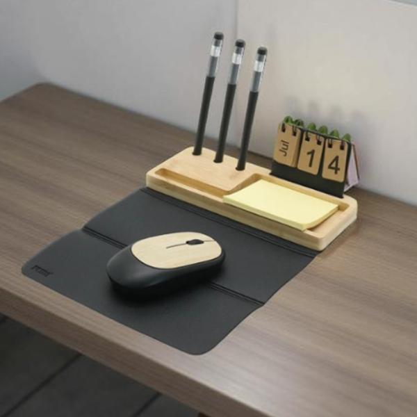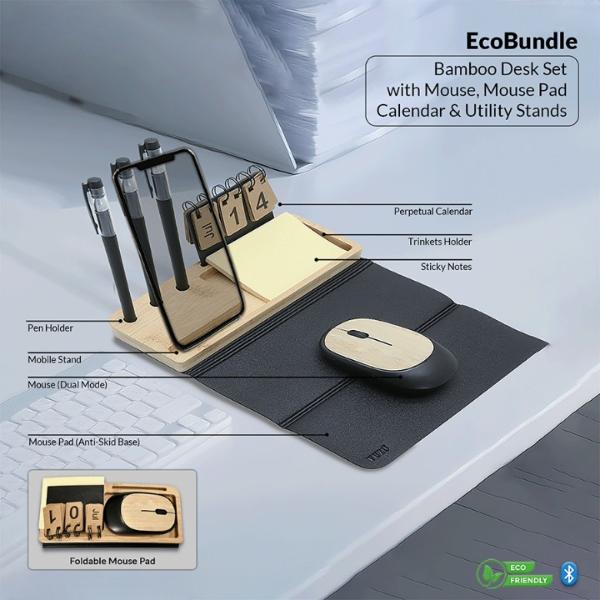 Product Features:Bamboo Desk UtilityFoldable Mouse PadMouse: Dual Mode ConnectivityPerpetual CalendarPen StandMobile StandTrinkets HolderSticky Notes (Included) Holder